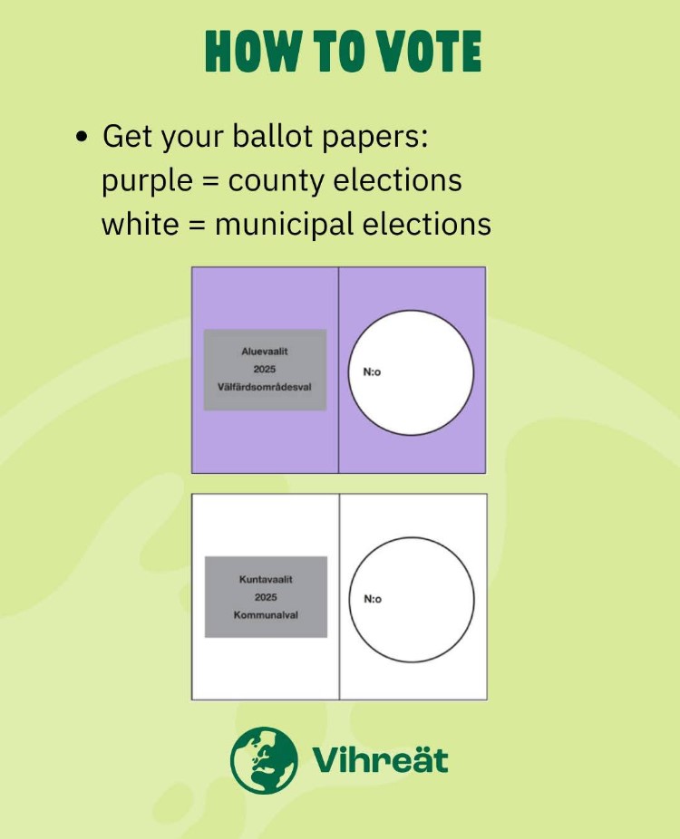 There are two elections at the same time. In the county elections (purple ballot paper), you vote for wellbeing counties (social services and health care) and in the municipal elections (white ballot paper) you elect the city council (education, construction, etc.).